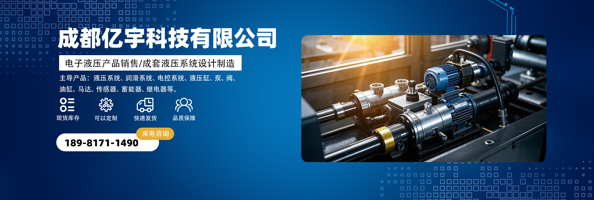 成都億宇科技有限公司是一家專業從事電子液壓產品銷售及成套液壓系統設計制造的高科技企業。 主導產品:液壓系統、潤滑系統、電控系統、液壓缸,泵,閥,油缸,馬達,接頭,管件,傳感器,蓄能器,繼電器,密封圈等。同時擁有熟悉國內外液壓機電產品的專業人員為您解決機械液壓方面的問題,并匯集了一批在流體傳動領域內具有豐富實踐經驗的專業技術人才,致力于各種高品質液壓產品及系統的研制工作。經過我們不懈的努力發展和創新,已與眾多國內外供應商建立了良好的合作關系,在價格及供貨周期上均有較